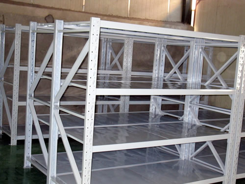 中型貨架是由立柱,橫梁,層板組裝而成的,獨立的一組有兩片立柱,這樣的貨架叫做主架。