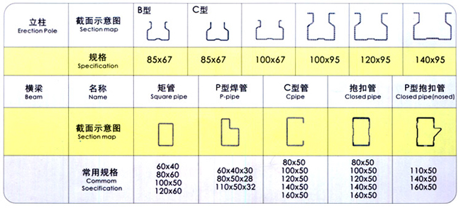橫梁:由一對柱卡與橫梁桿焊接抱合一體,橫梁桿采用兩個(gè)特制的C型鋼咬合而成,這種結(jié)構(gòu)使橫梁的上下兩個(gè)面的材料厚度增加一倍,從而使橫梁承載方向的慣性矩大大增強(qiáng),充分利用橫梁的抗載容量,具有重量輕、承載大、經(jīng)濟(jì)性好的特點(diǎn)。為確保橫梁在不正常外力作用下的脫落,特殊設(shè)計(jì)了橫梁與立柱連接的防脫落保險(xiǎn)銷,以確保使用的安全性。