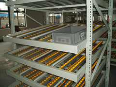 滾輪式料架簡稱流利架,是將貨物置于滾輪上,利用一邊通道存貨,另一邊通道取貨。料架朝出貨方向向下傾斜,貨物在重力作用下向下滑動?蓪(shí)現(xiàn)先進(jìn)先出,并可實(shí)現(xiàn)一次補(bǔ)貨,多次揀貨。流利架存儲效率高,適合大量貨